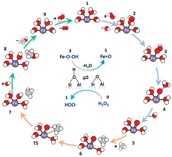 Proposed reaction scheme of the reaction pathway for direct methane oxidation to methanol over Cu−Fe(2/0.1)/ZSM-5 using H2O2 as the oxidant. Red, purple, gray, and white balls represent O, Fe, C, and H atoms, respectively [70]. Adapted with permission. Copyright 2021, American Chemical Society.