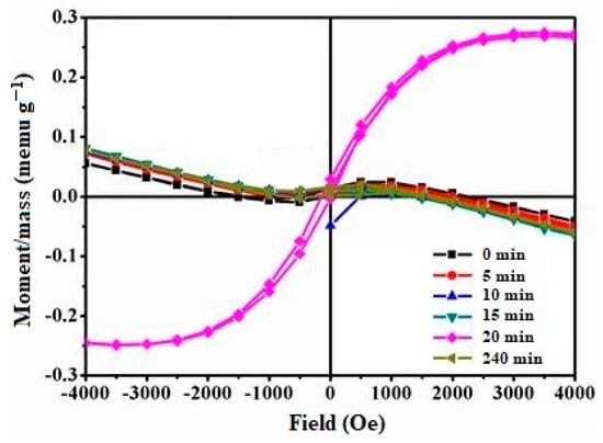 The magnetization hysteresis loops of Cu-TiO2 particles obtained from VSM measurements at 298 K are presented in Figure 6. The magnetization, coercivity, and retentivity of Cu-TiO2 are listed in Table 3 with the diamagnetic contribution subtracted [63,64]. It is evident that Cu-TiO2 exhibits ferromagnetic behavior with a weak magnetic moment and feeble coercivity. The reason behind the differences in the saturation moment (Ms) values observed for the different Cu-TiO2 samples lies in their varying compositions and microstructures. The Cu-TiO2 (0 min) sample had a relatively lower Ms value compared to Cu-TiO2 (240 min), likely due to the lower concentration of Cu(II) ions incorporated into the TiO2 lattice (0.48 at.% from XRF results). Cu-TiO2 (240 min) had a higher concentration of Cu(II) ions (0.73 at.% from XRF results), and Cu-TiO2 (240 min) exhibited a higher Ms value compared to Cu-TiO2 (0 min). Interestingly, Cu-TiO2 (20 min) displayed a significantly higher Ms value compared to the other samples (0.67 at.% from XRF results). This could be attributed to factors such as the formation of specific Cu-TiO2 microstructures or the presence of Cu(II) ions in particular configurations, resulting in enhanced magnetic properties. The saturation moment values are influenced by the concentration of Cu(II) ions incorporated into the TiO2 lattice, as well as other factors such as microstructure and configuration, which can affect the magnetic properties of the material. These results are in good agreement with other reports [65]. The appearance of the magnetic moment is attributed to the generation of oxygen vacancies and distortion in the local structure around the impurity (CuII) ion [66]. The VSM measurements reveal the ferromagnetic behavior of the Cu-TiO2 samples, and the observed magnetic moments are consistent with the Cu(II) concentrations in the material. The presence of oxygen vacancies and local structural distortions induced by Cu(II) ions contributed to the magnetic properties observed in the Cu-TiO2 particles.