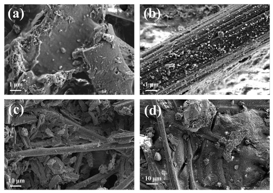 SEM images of Cu/C-BN-CC and Cu/C-BN-PT materials. (a,b) were Cu/C-BN-CC material. (c,d) were Cu/C-BN-PT material.