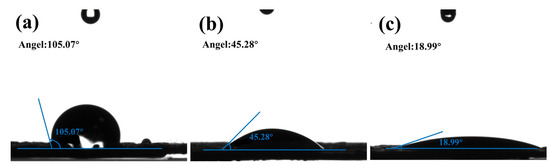 Surface contact angles of Cu/C-BN, Cu/C-BN-CC, and Cu/C-BN-PT materials. (a) Cu/C-BN-PT. (b) Cu/C-BN-CC. (c) Cu/C-BN.