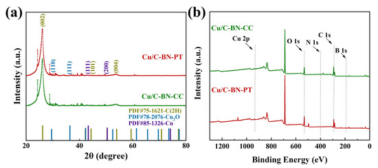 XRD and XPS images of Cu/C-BN-CC and Cu/C-BN-PT materials. (a) XRD image. (b) XPS image.