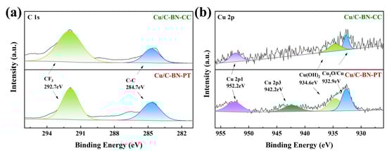 Cu 2p (a) and C 1s (b) of Cu/C-BN-CC and Cu/C-BN-PT materials XPS fine spectrum.