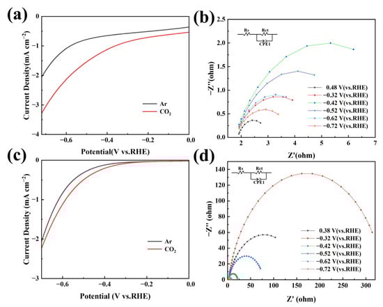 Figure 5 shows the linear sweep voltammetry (LSV) curves of Cu/C-BN-CC in Figure 5a and Cu/C-BN-PT in Figure 5c electrode materials in a 0.2 M Na2SO4 solution at a scanning rate of 10 mV/s. From the graph, there was a difference in the linear voltammetry curves of Cu/C-BN-CC and Cu/C-BN-PT materials under Ar and CO2 atmospheres. This is because under the conditions of introducing carbon dioxide, not only the HER occurs, but also CO2RR occurs. Therefore, the two materials have a certain electrocatalytic reduction effect on CO2. Compared to Cu/C-BN (see Figure S8), the current density of both materials has decreased, possibly due to the hydrophilicity and hydrophobicity of the materials affecting the catalytic reaction. Cu/C-BN-PT has a greater decrease in current density than Cu/C-BN-CC, which confirms the results of surface contact angle. Figure 5b,d shows the impedance test results of Cu/C-BN-CC and Cu/C-BN-PT electrocatalytic reduction of CO2 under different potential conditions. The fitting results show that the charge transfer resistance gradually decreases with the negative shift of potential, and the open circuit potential of Cu/C-BN-PT also shows a slight deviation toward the positive direction. The material impedances of Cu/C-BN, Cu/C-BN-CC, and Cu/C-BN-PT under open circuit potential (OCP) were 1.8 Ω, 1.2 Ω, and 155.2 Ω, respectively (detailed data can be found in Tables S1–S3). This indicates that the charge transfer resistance of Cu/C-BN-CC remains basically unchanged in the electrocatalytic CO2 reaction and the open circuit potential impedance of Cu/C-BN-PT material increases by more than 80 times. This indicates that adding PTFE to the surface of the material increases the difficulty of the overall catalytic reaction in the system, which is likely due to the enhanced hydrophobicity of the material, leading to a decrease in HER.