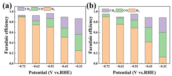 To understand the actual catalytic reaction process, the electrocatalytic products of two materials in a 1.0 M KHCO3 solution were collected using an airbag for detection during constant potential electrolysis at different potentials. The results are shown in Figure 6 (values are detailed in Tables S4–S6). The main gas-phase products of Cu/C-BN-CC and Cu/C-BN-PT materials were still hydrogen (H2), carbon monoxide (CO), and methane (CH4). Compared to Cu/C-BN, the HER rate of Cu/C-BN-CC material was slightly reduced. The FE of H2 was reduced by 8.6% at −0.32 V (vs. RHE), while the FE of H2 in Cu/C-BN-PT material was reduced by 20.1% at −0.32 V (vs. RHE). This indicates that changing the hydrophilicity and hydrophobicity of the material can have a certain inhibitory effect on the HER. The stronger the hydrophobicity of the material, the better the inhibitory effect on the HER.
