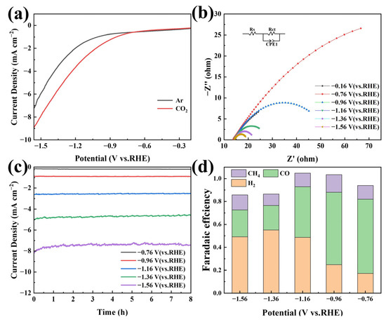 All electrochemical tests were performed using an electrochemical workstation (CHI660E, Shanghai Chenhua Instrument Co., Ltd., Shanghai, China). Before the test, high-purity argon gas (99.999%) was introduced into the cathode area for 30 min to remove air from the system. Then, high-purity carbon dioxide (99.99%) was introduced for 30 min to saturate the electrolyte solution with carbon dioxide. Throughout the experiment, a constant flow of carbon dioxide gas was supplied at a rate of 20 mL/min. The catalyst was initially activated by reduction at a potential of −0.82V (vs. RHE) for a duration of 3600 s. Then, the catalyst was tested using linear sweep voltammetry (LSV) with a scan rate of 10 mV/s in the potential range of 0 to −0.82V (vs. RHE). Using current density to evaluate the electrocatalytic performance of materials, the current density was obtained by dividing the measured current data by the geometric area of the material. Electrochemical impedance spectroscopy (EIS) was performed at potentials ranging from −0.32 to −0.72 V (vs. RHE), with a frequency range of 105 to 0.1 Hz and an amplitude of 5 mV. The ZView (Version: 2.9 c) software was used to perform linear fitting on it and obtain the Nyquist plot of the semicircular region. The fitted circuit diagram is shown in the impedance map. In the i-t test, gas products were collected by a gas bag, and the cathode gas products were detected using gas chromatography (GC-9890B, Shanghai Linghua Instrument Co. Ltd., Shanghai, China) with a carrier gas of 99.999% high-purity argon, a gas quantitative injection tube with a capacity of 1 mL, a thermal conductivity detector (TCD, Shanghai Linghua Instrument Co. Ltd., Shanghai, China) temperature of 80 °C, and a column box temperature of 120 °C. In addition, another gas chromatography (GC2060, Shanghai Ruimin Instrument Co. Ltd., Shanghai, China) was carried out with a carrier gas of 99.999% high-purity nitrogen, an injector temperature of 150 °C, a column box temperature of 50 °C, a hydrogen-ion flame detector (FID, Shanghai Ruimin Instrument Co. Ltd., Shanghai, China) temperature of 150 °C, and a conversion oven temperature of 330 °C.