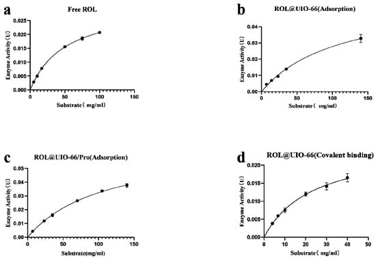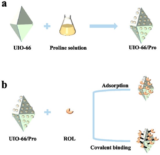 Referring to Hu et al., 50 mg of UIO−66 or UIO−66/Pro was combined with 2 mL of 2.5 mg/mL enzyme dissolved in the enzyme. After stirring on a magnetic stirrer for 2 h, 100% saturated ammonium sulfate solution was added. The cross-linking process required 30 min of stirring at 4 °C, the addition of 25% glutaric dialdehyde, and 3 h of stirring at 4 °C. Following immobilization, the enzyme immobilized on ROL@UIO−66/Pro was obtained after washing three times with 5 mL of PBS (0.05 M, pH = 7.5) [].