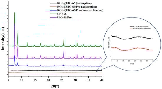 XRD patterns of UIO−66, UIO−66/Pro, ROL@UIO−66 (adsorption), ROL@UIO−66/Pro (adsorption), and ROL@UIO−66/Pro (covalent binding).