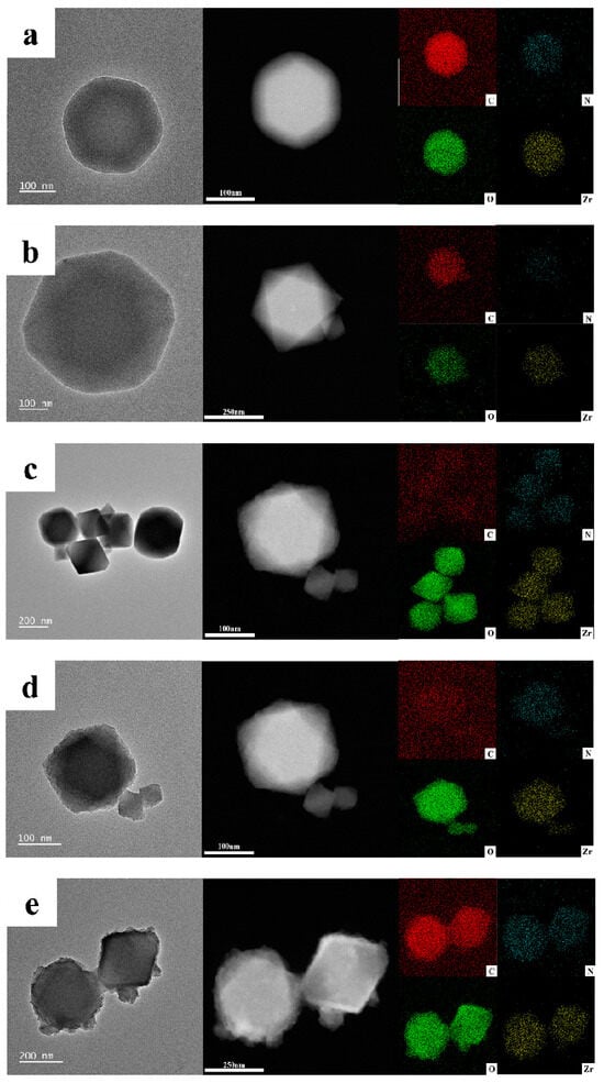 In addition, SEM images showed that the synthesized UIO−66, UIO−66/Pro, ROL@UIO−66, and ROL@UIO−66/Pro prepared by adsorption and the ROL@UIO−66/Pro prepared by the covalent-binding method possess a distinct crystal structure with well-defined octahedral morphology. Furthermore, the immobilized enzyme prepared using UIO−66/Pro and the covalent-binding method exhibits a slightly smaller size compared to UIO−66. On the other hand, the immobilized enzyme prepared through adsorption has the smallest size, which aligns with the XRD diffraction peak results []. The rhombic shape of UIO−66 can be observed by TEM, and the fuzzy edges of the TEM of the immobilized enzyme are due to the attachment of the enzyme to the carrier surface. EDS analysis reveals the presence of elements C, N, O, and Zr in UIO−66, UIO−66/Pro, ROL@UIO−66, and ROL@UIO−66/Pro, as seen in Figure 3. This confirms the production of UIO−66 and the uniform distribution of the carrier and immobilized enzyme elements (Figure 4). It was also shown by TGA results that the weight loss of the immobilized enzymes ROL@UIO−66 and ROL@UIO−66/Pro occurring between 200 °C and 500 °C was mainly due to thermal degradation of the enzyme protein molecules (Figure 5), providing further evidence for the presence of ROL. The findings of SEM, EDS, and TGA show that ROL can be successfully fixed by the method proposed in this work.