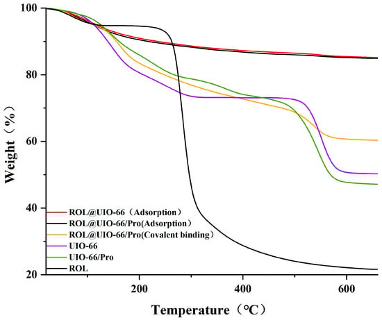 TGA of UIO−66, UIO−66/Pro, ROL@UIO−66 (adsorption), ROL@UIO−66/Pro (adsorption), and ROL@UIO−66/Pro (covalent binding).