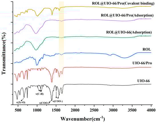 Fourier infrared spectroscopy of UIO−66, UIO−66/Pro, ROL@UIO−66 (adsorption), ROL@UIO−66/Pro (adsorption), and ROL@UIO−66/Pro (covalent binding).