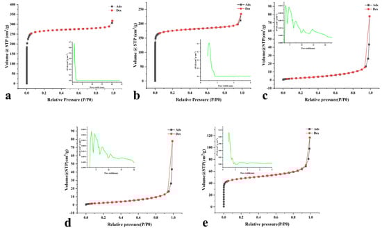 Nitrogen sorption isotherms and mesoporous size distributions of UIO−66 (a), UIO−66/Pro (b), ROL@UIO−66 by adsorption (c), ROL@UIO−66/Pro by adsorption (d), and ROL@UIO−66/Pro by covalent binding (e).