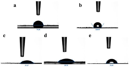 Regarding N2 adsorption/desorption isotherms, both the UIO−66 material and UIO−66/Pro material displayed type I adsorption isotherms, indicating their microporous nature. Additionally, the N2 adsorption/desorption isotherms confirmed the presence of a type I isotherm, further confirming the microporous structure of both the UIO−66 material and UIO−66/Pro material. Conversely, the N2 adsorption–desorption isotherms of ROL@UIO−66 and ROL@UIO−66/Pro, which were prepared using the adsorption method, exhibited type-II adsorption isotherm characteristics with a noticeable hysteresis loop (Figure 7c,d). This indicates the presence of both micropores and mesopores in ROL@UIO−66 and ROL@UIO−66/Pro. The N2 adsorption–desorption isotherms of ROL@UIO−66/Pro, synthesized using the covalent cross-linking approach, exhibited type I adsorption isotherm characteristics. This suggests that both ROL@UIO−66 and ROL@UIO−66/Pro possess a microporous structure [,]. The specific surface areas of UIO−66 and UIO−66/Pro reached 817.944 m2/g and 513.717 m2/g, suggesting that UIO−66 and UIO−66/Pro could be used as suitable carriers for enzyme immobilization due to their high micropore structure and specific surface area. After pore size calculation by the density functional theory (DFT) method, UIO−66/Pro matched the pore size distribution curve of UIO−66 in the micropore interval []. The results showed a decrease in pore volume from 0.399 cc/g (UIO−66) to 0.274 cc/g (UIO−66/Pro) (Table 1). This indicates that the Pro occupies a portion of the pore channel of UIO−66. Furthermore, the UIO−66/Pro exhibited excellent properties as an immobilized carrier and altered the properties of UIO−66 after Pro modification, which was similar to previously reported findings [,]. It was reported that there are ROL molecules, a protein molecule with length a = 92.77 Å, b = 128.86 Å, and c = 78.35 Å (from The National Center for Biotechnology Information), which are smaller than those of the carrier. So, it appears that the enzyme blocked some of the pore channels since the pore volumes of immobilized enzymes obtained by adsorption were 0.020 cc/g (ROL@UIO−66) and 0.023 cc/g (ROL@UIO−66/Pro), which were even less than those of the carrier. The pore volume of the immobilized enzyme (ROL@UIO−66/Pro) created using the covalent-binding approach was larger (0.099 cc/g) than that achieved with the adsorption method. This indicates that the occurrence of pore clogging was minimized, resulting in a decrease in mass transfer resistance []. The mesoporous structure observed in the immobilized enzyme, generated via the adsorption approach, is likely a result of structural modifications that occur during the adsorption process. These modifications led to local instability and collapse of the pores in UIO−66, as indicated by the XRD pattern [,]. In addition, the hydrophilicity of UIO−66, UIO−66/Pro, and the immobilized enzymes was tested by contact angle measurements. Water droplets on UIO−66 had a contact angle of 79.30° (Figure 8a), which was increased to 120.95° (Figure 8b) after Pro modification, with a significant increase in the hydrophobicity of the surface, which is in agreement with the results of Rani et al. []. Following the immobilization of ROL, the contact angles of the immobilized enzymes were all reduced to varying degrees, which may be attributed to the enhanced hydrophilicity of the immobilized enzymes. The increased hydrophobicity (75.59°) of the enzyme ROL@UIO−66/Pro when immobilized through covalent bonding, compared to those immobilized by the adsorption method [ROL@UIO−66 (37.37°) and ROL@UIO−66/Pro (39.70°)], can be attributed to the greater extent of covalent bonding between the enzyme and the carrier surface, rather than to direct plugging of the pores of the carrier. The above results indicate that the hydrophilicity of the immobilized enzyme prepared by the two methods varies greatly.