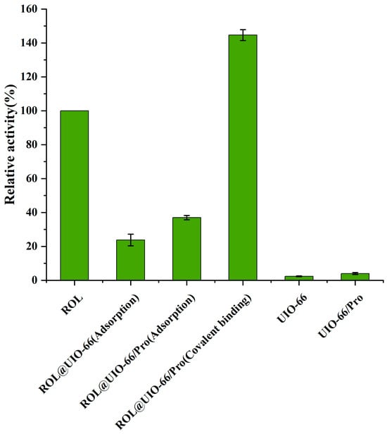 Figure 9 displays the results of a comparison of the activity of the immobilized enzymes ROL@UIO−66 and ROL@UIO−66/Pro that were produced using free ROL, adsorption, and the covalent-bonding technique. The research conducted revealed that the enzyme activity of the immobilized enzyme, generated using the adsorption method utilizing UIO−66/Pro as the carrier, was approximately 1.5 times more than that of the immobilized enzyme using UIO−66 as the carrier. The immobilized enzyme ROL@UIO−66/Pro, produced using the covalent-bonding technique, exhibited 1.4 times more activity compared to the free enzyme. The presence of the two carriers did not affect the determination of the activity. Comparison of the specific enzyme activities of the immobilized enzymes ROL@UIO−66 and ROL@UIO−66/Pro produced by free ROL, adsorption, and covalent-bonding techniques are detailed in Schedule S1. Among them, the immobilized enzyme prepared by the covalent method showed a superior enhancement of enzyme activity of 0.0647 U/mg, which was 1.73 times higher than that of the free enzyme (0.0373 U/mg). The results indicated that there may be hydrogen bonding between the UIO−66 material and Pro, forming a unique nanopore environment that exhibited greater adsorption capacity []. The primary impact of the immobilized enzyme constructed through the covalent-bonding technique is likely due to its ability to effectively maintain the structural conformation of the ROL. Additionally, it could even cause a favorable alteration in the ROL’s conformation, leading to an improvement in catalytic activity []. During the process of immobilizing enzymes through adsorption, the presence of ROL may block the pores of the carrier material. This blockage leads to an increase in the resistance to mass transfer and a decrease in enzyme activity. Additionally, the ROL that blocks the carrier pores can cause changes in the enzyme’s conformation during the immobilization process, thereby affecting its catalytic activity [].