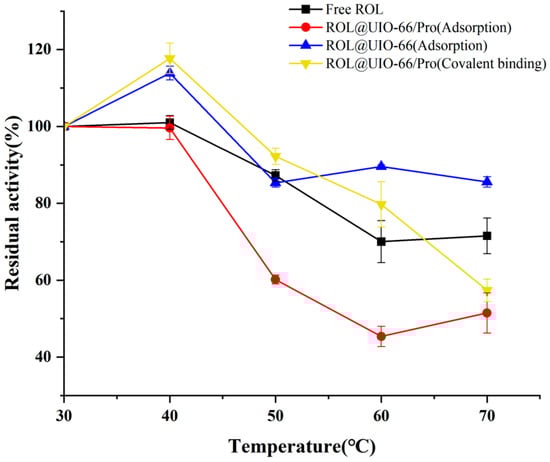 Effects of different temperature on enzymatic activities of ROL, ROL@UIO−66 (adsorption), ROL@UIO−66/Pro (adsorption), and ROL@UIO−66/Pro (covalent binding).
