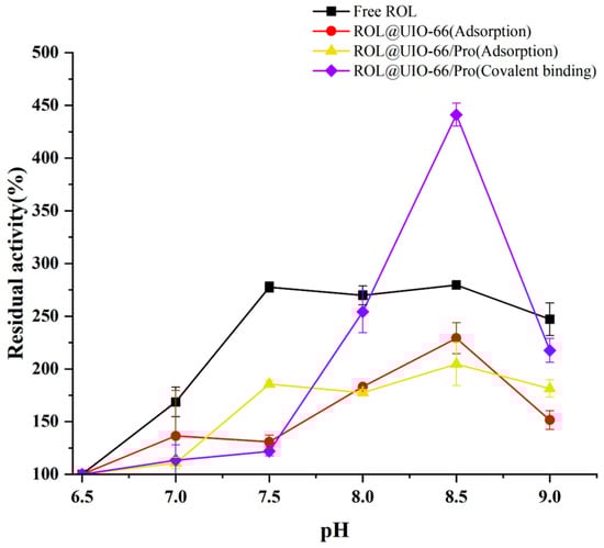 Effects of different pH on enzymatic activities of ROL, ROL@UIO−66 (adsorption), ROL@UIO−66/Pro (adsorption), and ROL@UIO−66/Pro (covalent binding).