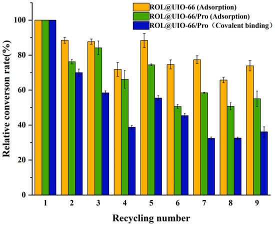 Relative conversion rate of ROL@UIO−66 (adsorption), ROL@UIO−66/Pro (adsorption), ROL@UIO−66 (covalent binding), and ROL@UIO−66/Pro (covalent binding).