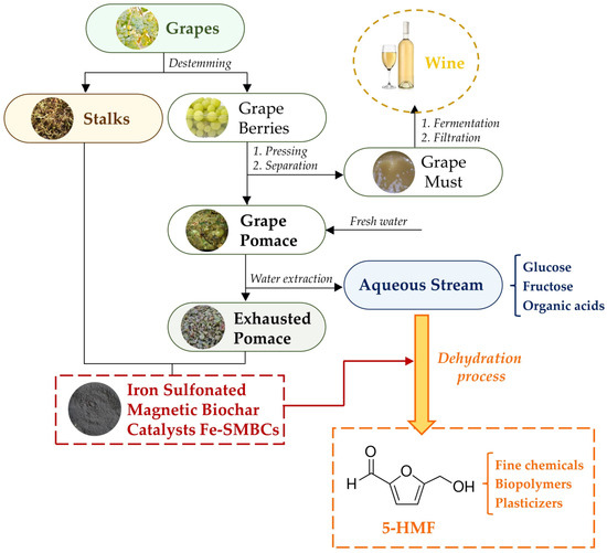 In this work, a closed-loop strategy for the management and valorization of winery waste was proposed. The exhausted pomace and grape stalks that are typically obtained from white wine industries were used as a source of simple sugars, namely, glucose and fructose, and of lignocellulosic feedstock for the preparation of selective catalysts for the 5-hydroxymethylfurfural (5-HMF) production from fructose. A novel synthetic procedure was developed for the synthesis of iron-sulfonated magnetic biochar catalysts (Fe-SMBCs). Fourier transform infrared spectroscopy (FTIR), X-ray diffraction (XRD), scanning electron microscopy (SEM), energy-dispersive X-ray (EDX), BET surface area, porous structure analysis and determination of total amount of acid sites were performed in order to characterize the physico-chemical properties of the synthesized systems. Then, these heterogeneous catalysts were successfully tested via the dehydration of simple sugars into 5-HMF by using methyl isobutyl ketone (MIBK) and gamma valerolactone (GVL) as co-solvents. The optimum 5-HMF yield of 40.9 ± 1.1%mol with a selectivity of 59.8 ± 2.6%mol was achieved by adopting the following optimized conditions: 0.1 g of catalyst, volume ratio of GVL to H2O = 2 to 1, 403 K, 6 h. In addition, the catalyst was easily recycled using an external magnetic field and used for at least five reaction cycles without significant loss of catalytic activity.