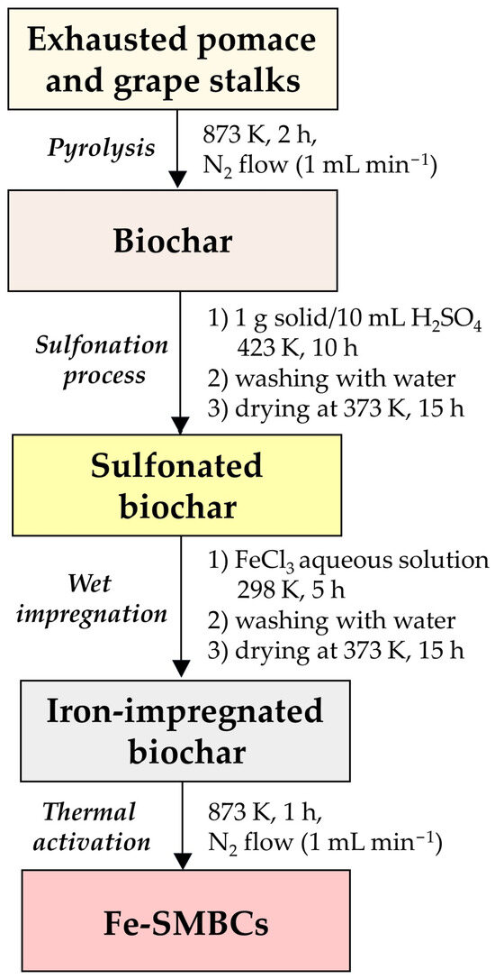 A multi-step procedure was used for the synthesis of iron-sulfonated magnetic biochar catalysts (Fe-SMBCs). The process diagram describing the different synthetic steps is reported in Figure 1. Firstly, biochar was obtained by pyrolysis of dried biomass (exhausted pomace and grape stalks) at 873 K for 2 h under nitrogen flow (heating rate 10 K min−1, Eurotherm tubular furnace). Subsequently, the biochar obtained was subjected to sulfonation treatment. In particular, the carbonaceous material was immersed into concentrated sulfuric acid (95–98%wt, 1 g solid/10 mL H2SO4) and kept at 423 K for 10 h under stirring (300 rpm) in a Teflon-lined stainless autoclave. The recovered solid was then filtered, washed with deionized water (until the filtrate was neutral and free of sulfate ions [60]) and dried at 373 K for 15 h. The wet impregnation technique was used to deposit nanometric iron oxide particles on the surface of the sulfonated biochar by using ferric chloride hexahydrate as a precursor. Then, 2 g of sample was suspended in 50 mL of an aqueous solution of FeCl3·6H2O (weight ratio of Fe-to-biochar 25%) and kept at room temperature for 5 h at 300 rpm. The suspension was then evaporated at 383 K, and the solid was dried at 373 K for 15 h. Finally, Fe-SMBCs were obtained after thermal activation of iron-impregnated biochar at 873 K for 1 h with the formation of Fe3O4 on the surface of the catalysts.