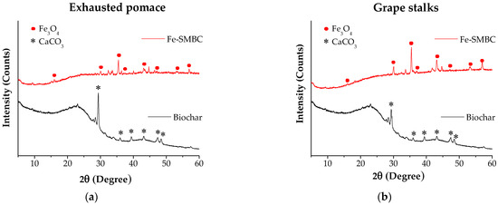 Subsequently, the sulfonated biochar was impregnated with an aqueous solution of iron (III) chloride dihydrate (298 K, 5 h) and thermally activated (873 K, 1 h under a N2 flow) in order to obtain the formation of iron-sulfonated magnetic biochar catalysts. Figure 4 shows the XRD patterns of the biochar and Fe-SMBCs obtained from the two different types of winery waste (exhausted pomace and grape stalks).