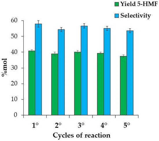 A total sugar conversion of 69.5 ± 1.4%mol–68.4 ± 1.3%mol was obtained with a 5-HMF yield of 40.7 ± 1.2%mol–40.9 ± 1.1%mol and selectivity of 58.6 ± 2.8%mol–59.8 ± 2.6%mol, resulting in very similar activities with respect to the use of pure reagents. Once the robustness was checked, in order to evaluate the stability of the Fe-SMBCs, the catalyst was recovered at the end of the first reaction cycle by using an external magnet and reused for at least five reaction cycles without any significant loss of catalytic activity (Figure 7). No sulfate ions were detected in the reaction mixture after the process [60]. In addition, the acid properties of the catalyst were recovered at the end of the 5° cycle of reaction (total acid density = 0.90 mmolSO3H/g), which confirms the stability of the catalyst and the absence of leaching during the process.
