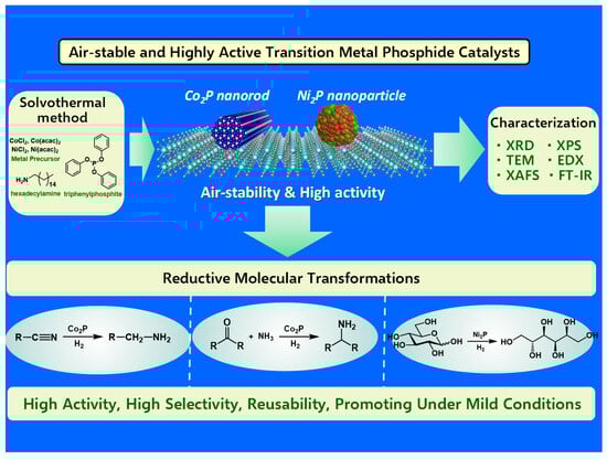 Recent advances have witnessed a surge in reports detailing the development of non-precious metal nanoparticle catalysts, which demonstrate higher activity compared to traditional sponge metal catalysts [,,]. Despite these advancements, the air instability issue of non-precious metal nanoparticle catalysts remains unresolved. These novel catalysts frequently require the in situ generation of nanoparticles using H2 reduction at elevated temperatures prior to their application. The air instability not only raises safety concerns due to ignition risks, but also impedes the precise design of nanoparticle catalysts, including aspects such as morphology control and composite formation with a support material. Additionally, it complicates the structural analysis of the actual active species. Consequently, the development of air-stable non-precious metal catalysts would not only enhance the safety profile of reaction systems, but also expand the possibilities for precise design of catalysts and analytical evaluation. Such progress could potentially lead to the discovery of even more active catalysts. In this context, our group has embarked on developing non-precious metal catalysts that are both air-stable and highly active. Our efforts have led to the discovery that nanosized transition metal phosphides function as non-precious metal catalysts, combining atmospheric safety, high activity, and durability for a wide range of hydrogenation reactions including the hydrogenation of nitriles to primary amines, reductive amination of carbonyl compounds, and the aqueous hydrogenation reaction of mono- and disaccharides to sugar alcohols.