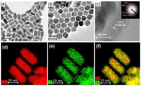 Cobalt phosphide nanoparticle is prepared via the solvothermal method. Cobalt phosphides with an hexagonal-columnar structure with 20 nm in length and 9 nm in width (nano-Co2P) can be obtained by the thermal decomposition of cobalt chloride and triphenyl phosphite in 1-octadecene in the presence of hexadecylamine, as depicted in Figure 2a,b [,]. The composition of the cobalt phosphide nanorods was confirmed as Co2P through selected area electron diffraction (SAED) patterns (Figure 2c), X-ray diffraction (XRD) patterns, and elemental analysis by energy dispersive X-ray spectroscopy (EDS) (Figure 2d–f). The prepared nano-Co2P is non-pyrophoric and can be handled in air. Furthermore, the nano-Co2P is easily immobilized on various metal-oxide supports under atmospheric conditions by redispersing it in hexane followed by the addition of the supports.