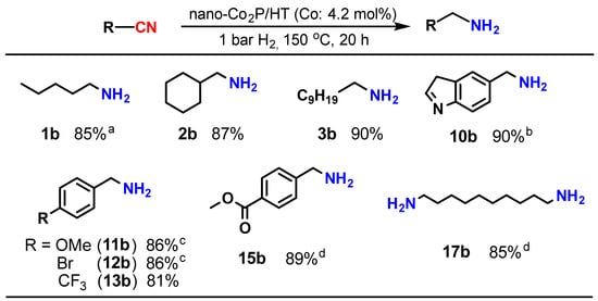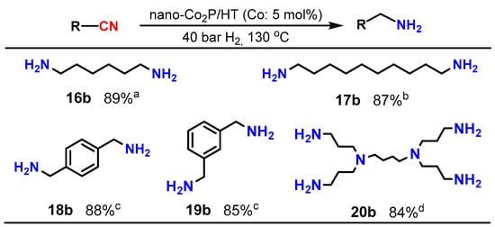 Upon investigating the catalysis of supported nano-Co2P for the nitrile hydrogenation, it was discovered that nano-Co2P supported on hydrotalcite (HT: Mg6Al2(OH)16CO3·4H2O) (nano-Co2P/HT) is an extremely effective catalyst for the hydrogenation of nitriles to primary amines []. Nano-Co2P/HT was able to hydrogenate various nitriles including aliphatic nitriles (Table 1, entries 1–4), aromatic nitriles (entries 5 and 6), heterocyclic nitriles (entries 7–10), and substituted aromatic nitriles (entries 11–15), providing the corresponding primary amines with high yields. Nano-Co2P is also effective for polynitriles containing multiple nitrile groups within their molecules, as demonstrated in Figure 3. For example, 1,6-hexamethylenediamine (16b), a significant precursor of Nylon-6,6, can be obtained from adiponitrile with a high yield. Similarly, the biomass derivative sebaconitrile is smoothly transformed into the corresponding 1,10-diaminodecane (17b). Furthermore, this catalyst is applicable to tetranitriles, enabling the synthesis of important amines (20b) used as intermediates in the production of functional materials such as dendrimers. Unlike previously reported non-precious metal catalysts that require high H2 pressure to facilitate the reaction, nano-Co2P/HT exhibits high activity under atmospheric H2 pressure, selectively yielding primary amines (Figure 4).