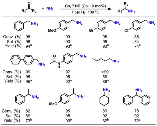 Reductive amination of carbonyl compounds by Co2P NR at 1 bar H2. Reaction conditions: Co2P NR (Co: 0.05 mmol), substrate (0.5 mmol), 12 h. a NH3 aq. 25% (3 mL). b NH4Oac (0.1 g), ethanol (3 mL). c NH4Oac (0.15 g), ethanol (3 mL), 110 °C, 20 h.