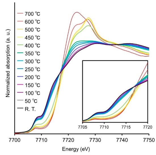 To further investigate the air stability, structural changes of Co2P NR with increasing temperature in air were evaluated using XAFS measurements, as shown in Figure 9. The absorption edge energy gradually shifts to higher energies from 200 °C, with the intensity of the characteristic peak of oxides (7722 eV) increasing around 400 °C, indicating structural changes due to oxidation. Indeed, Co2P NR treated at 300 °C under atmospheric conditions exhibited significantly reduced catalytic activity compared to untreated Co2P NR, whereas Co2P NR treated at 200 °C maintained nearly equivalent catalytic activity. These findings robustly demonstrate that the active cobalt species in Co2P NR exhibit remarkable resistance against oxidative degradation.
