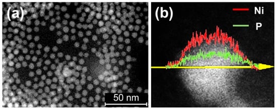 Similar to the preparation method for cobalt phosphide nanoparticle, replacing cobalt with nickel results in the successful synthesis of nickel phosphide nanoparticles (nano-Ni2P) with an average diameter of 5 nm and a composition of Ni2P, as shown in Figure 10a. Energy-dispersive X-ray (EDX) line analysis in Figure 10b demonstrates the uniform dispersion of nickel and phosphorus within nano-Ni2P []. Additionally, nano-Ni2P, such as cobalt phosphide, exhibits non-pyrophoricity and stability in air in a low oxidation state [].
