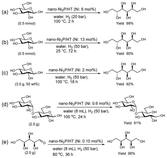 Selective hydrogenation of sugars using nano-Ni2P/HT in water. (a) Hydrogenation of D-glucose under standard conditions. (b) Hydrogenation of D-glucose at room temperature. (c) Hydrogenation of D-glucose at a concentration of 50 wt%. (d) Hydrogenation of maltose with nano-Ni2P/HT (0.6 mol% Ni). (e) Hydrogenation of D-xylose with nano-Ni2P/HT (0.10 mol% Ni).
