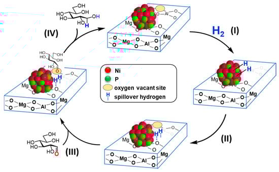 The proposed reaction mechanism for the hydrogenation of D-glucose catalyzed by the synergistically catalytic behavior of nano-Ni2P and HT is illustrated in Figure 12. Initially, (I) H2 is activated at the Ni–Ni bond sites on the nano-Ni2P surface. (II) The adsorbed hydrogen species on the nano-Ni2P surface spill over onto the interface or the surface of HT. Meanwhile, (III) the aldehyde group of D-glucose is activated at the oxygen-deficient sites on the HT surface. (IV) The activated aldehyde group is then reduced by the spilled-over hydrogen species to form D-sorbitol, thus completing a catalytic cycle. The activation of H2 by nano-Ni2P was confirmed using H2–D2 exchange reaction and H2–TPD, while the activation of the carbonyl moiety by HT was confirmed through IR analysis. Consequently, the notable catalytic efficiency is attributed to the concurrent activation of H2 by nano-Ni2P and D-glucose by HT, illustrating their synergistic effect.