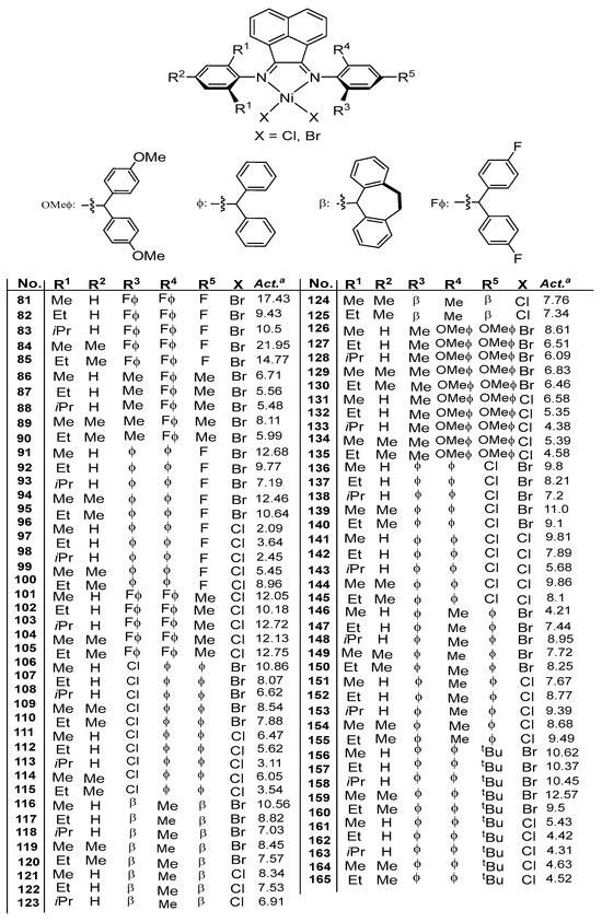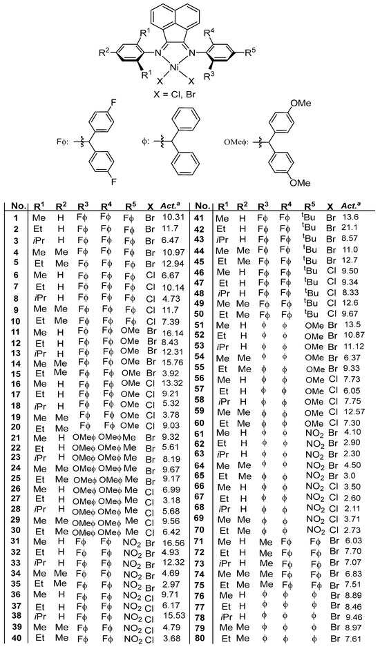 - Du, S.; Kong, S.; Shi, Q.; Mao, J.; Guo, C.; Yi, J.; Liang, T.; Sun, W.-H. Enhancing the activity and thermal stability of nickel complex precatalysts using 1-[2, 6-bis (bis (4-fluorophenyl) methyl)-4-methyl phenylimino]-2-aryliminoacenaphthylene derivatives. Organometallics 2015, 34, 582–590. [Google Scholar] [CrossRef]