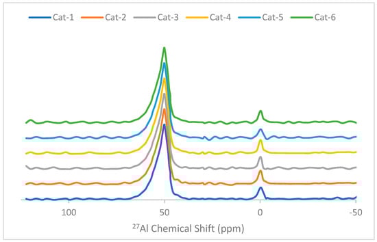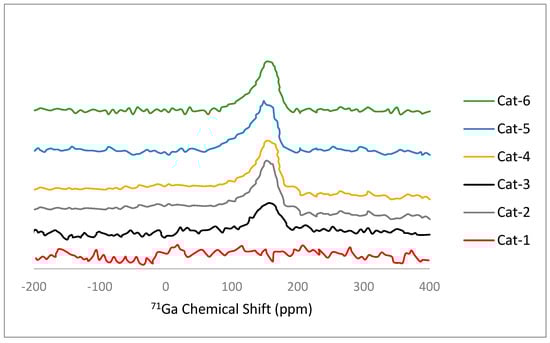 The 71Ga MAS NMR spectra of the catalyst samples are presented in Figure 4. All the catalyst samples (Cat-2 to Cat-6) except Cat-1 displayed a single broad peak with a maxima in the range of 156–157 ppm. Since Cat-1 did not contain any gallium, no signal was observed. It has been reported [30] that gallium exists in two different forms in gallo-alumino-silicates. The first Ga3+ tetrahedral framework (GaTd) species exhibit a peak at 156 ppm while the second G3+ octahedral extra-framework (GaOh) species exhibit a peak at 50 ppm. However, in most cases, the peak related to GaOh was not resolved because of a strong quadrupolar effect [30,31]. The intensity of the peak (156–157 ppm) was increased with an increase in the Ga/(Al+Ga) ratio, indicating an increase in the tetrahedral framework (GaTd) species.