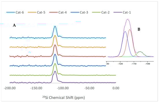 29Si MAS NMR spectra of catalyst samples (A), and deconvolution of peaks (B).
