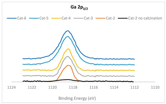 The X-ray photoelectron spectra (XPS) of the Ga 2p3/2 region for Cat-2 to Cat-6 samples are presented in Figure 6. The XPS study of Cat-2 was performed before calcination and after calcination, whereas the XPS study of all the other catalysts was performed after calcination at 550 °C. The Cat-2 (without calcination) sample exhibited a very small peak at 1118.5 eV; however, after calcination, this peak was increased in intensity by several folds. All other catalyst samples exhibited a strong peak with maxima at 1118.5 eV. The intensity of this peak was increased with a surge in Ga/(Al+Ga). It has been reported [36] that the GaAlMFI sample showed a small peak before calcination. However, following calcination, the intensity of this peak was increased by 10 times, indicating the conversion of the framework Ga species to extra-framework Ga species. Therefore, it can be concluded that an increase in the Ga/(Al+Ga) ratio causes more increase in the extra-framework Ga species after calcination.