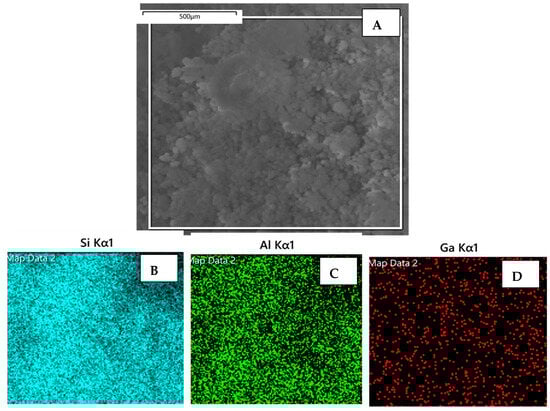 (A) Scanning electron microscope (SEM) micrograph of catalyst (Cat-2) sample, and elemental mapping of Si, Al, and Ga elements (B–D), respectively, based on the EDX analysis.