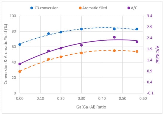 Plot of C3 conversion, aromatic yield, and aromatization/cracking (A/C) ratio against [Ga/(Ga+Al)] ratio of catalyst samples.