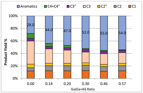 Distribution of product against [Ga/(Ga+Al)] ratio of catalyst samples.