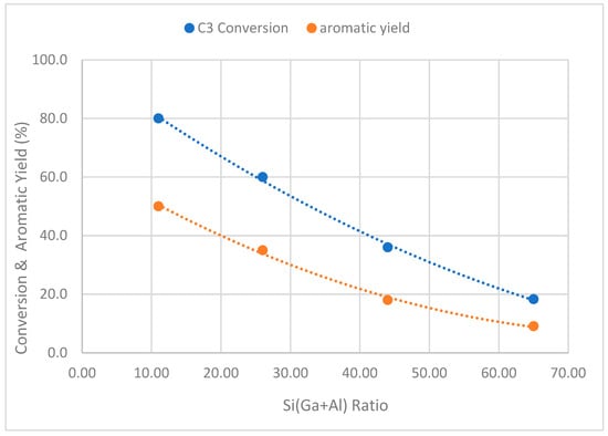 Plot of C3 conversion and aromatic yield against [Si/(Ga+Al)] ratio of catalyst samples.