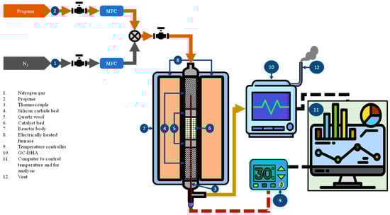 The aromatization of propane was conducted in a laboratory-scale fixed-bed reactor system as shown in Figure 13. The reactor tube (SS) was packed with 1.0 mL of sieved (500–1000 µm) catalyst particles in the middle along with the packing of inert silicon carbide particles above and below the catalyst. The catalyst was activated under flow of nitrogen (10 mL/min) for one hour at 550 °C. The reactor was then fed with nitrogen and propane in a molar ratio of 2:1. All reactions were executed at 550 °C, with GHSV of 1600 h−1 and TOS of 5 h. The online GC equipped with two detectors, i.e., TCD and FID was utilized for characterization of products. The detailed hydrocarbon analysis was obtained using DHA software of Agilent. The flow diagram of fixed bed reactor is shown in Figure 11.