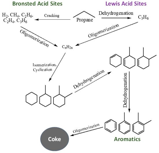 A general reaction mechanism during aromatization of propane over Bronsted and Lewis acid sites.