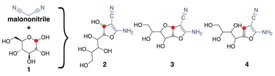 - Eger, K.; Storz, T.; Spätling, S. The First Condensation Product of Malononitrile with Ribose. Liebigs Ann. Chem. 1989, 1989, 1049. [Google Scholar] [CrossRef]