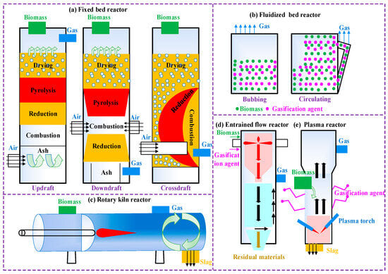 Pyrolysis technology plays a significant role in the sectors of petrochemicals, chemicals, and energy and is responsible for the production of various energy products []. In response to the changing global energy security situation and the increasing emphasis on environmental protection, enterprises in the petrochemical, chemical, and energy production sectors are actively exploring new pyrolysis technologies. As one of the important thermochemical conversion technologies, biomass pyrolysis refers to the process of heating and degrading biomass raw materials to combustible gas, liquid bio-oil, and solid biochar under anaerobic or anoxic conditions []. In the process of pyrolysis, biomass raw materials would incur a series of physical (heat transfer and material transfer during the heating process, etc.) and chemical changes (primary, secondary, and even multi-level chemical reactions) by controlling the conditions of the pyrolysis process (raw material types and compositions, reaction temperatures, heating rate, residence times and reactor types, etc.), resulting in different types of products []. The technology and principle of the traditional pyrolysis of biomass are shown in Figure 1, and the research status of pyrolysis and gasification reactors nationally and globally is shown in Table 1. Among them, the fixed bed reactor is an internal thermal coupling process, which can be divided into updraft, downdraft, and transverse fixed bed reactors according to the movement direction of airflow in the furnace. That is, gas is used as a heat carrier to make contact with raw materials and, in turn, provide heat. The structure is relatively simple and has many advantages, such as a wide adaptability of raw materials, simple manufacturing, low costs, few moving parts, simple operation, and the high thermal efficiency of the system. However, fixed bed pyrolysis has certain requirements on the particle size, ash content, and ash melting point of biomass, and to maintain the autothermal reaction system, air should be used as a gasifying agent. Thus, the resulting gas is easy to dilute with N2 and CO2, reducing the content of effective components such as H2 and CO, and the content of by-products such as tar is high, which is not conducive to the production of hydrogen-rich gas. At the same time, according to the structure, the pyrolysis process of the fluidized bed is divided into a bubbling fluidized bed gasifier, circulating fluidized bed gasifier, airflow bed gasifier, conical fluidized bed gasifier, etc., which have the advantages of high heat and mass transfer efficiency, high production capacity, and uniform reaction temperature. However, the dust entrainment is serious, the gas–solid residence time is short, and the carbon conversion rate is low. In addition, the pyrolysis process of the airflow bed uses oxygen as a gasifying agent, and the operating environment of high temperature and high pressure is dangerous. Therefore, it is urgent to solve the various problems caused by controlling the sub-processes of biomass pyrolysis and gasification. It is also urgent to reform and solve the various problems that arise in different chemical reactions caused by the mutual shackles of thermodynamics and kinetics. In particular, tar is an important by-product; it is difficult to achieve selective regulation and the efficient removal of the reaction process.