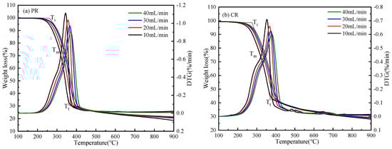 The TG and corresponding DTG curves of PR and CR at the heating rates of 10, 20, 30, and 40 °C/min are shown in Figure 2. The higher the peak value, the faster the reaction rate at this temperature. As shown in Figure 2, it is quite clear that the whole decomposition process can be categorized into three successive stages, i.e., drying, rapid pyrolysis, and carbonization. In the drying stage (before 200 °C), the biomass samples were preheated, and the external moisture gradually evaporated and was removed from light volatile matter. Since biomass is a complex polymer, structural evolutions, like depolymerization, reorganization, and glass transition, would take place in this stage, that is, the modification of raw biomass materials []. The rapid pyrolysis stage (200~600 °C) was the major weight loss stage, in which a great number of volatile substances were continuously generated due to the thermal decompositions of weak bonds between cellulose and hemicellulose as well as the linkages between lignin monomers. Additionally, it was observed that the temperature ranges during the pyrolysis of PR and CR were similar, which was 200–550 °C at different heating rates, which is the maximum decomposition rate of both hemicellulose and cellulose. In particular, more components of CR and PR were decomposed or transformed before 400 °C. The maximum mass loss rate (~50%) was about 330~390 °C, and the corresponding maximum weight loss temperatures were located at 365 °C and 370 °C, respectively, with a heating rate of 30 °C/min. So, the order of their thermal stability was CR > PR. In other words, the range of the pyrolysis interval for PR was similar to that of CR, indicating that a similar pyrolysis reaction was shown in the pyrolysis process of wood biomass. In the carbonization stage (600–900 °C), the rest of the lignin fractions with high bond energies tended to aggregate, forming char structures (fixed carbon) and presenting slow variations in weight loss. Among the three major components in biomass, lignin is the only polymer that has an aromatic structure, including various branches and strengthened bonds [], which gives it high thermal stability. Thus, thermal decomposition takes place over a wider temperature range and covers the whole pyrolysis process. Meanwhile, the TG/DTG curves were roughly close to a straight line until the end of the pyrolysis reaction.