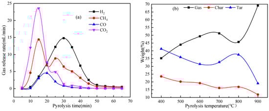 Effect of pyrolysis temperature on the release rate (a) and distribution of pyrolysis products (b).