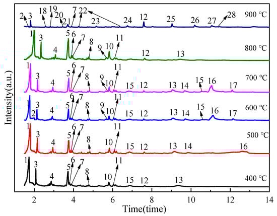 The ion chromatography of tar and the serial numbers of corresponding substances from the catalytic pyrolysis of MWC at 400–900 °C are shown in Figure 4 and Table S1. The distribution of liquid products at different temperatures is shown in Table 5. From the distribution of compounds in tar composition, the composition is the same between 400 °C and 800 °C, mainly including aldehydes (AL), acids (AC), alcohols (ALc), ketones (KE), phenols (PH), furans (FU), esters (ES), and a small number of hydrocarbons. However, the content of the same substance varied greatly at different temperatures. At 400 °C, the AC substances were mainly acetic acid (6.99%), and the KE substances were acetone, butanone, pentanone, and their derivatives, with a content of 70.27%. The AL substances included succinaldehyde, furfural, carboxylic aldehyde, and their derivatives, with a content of 4.42%. The ALc substances included butanediol, methanol, alcohol, and their derivatives, with a content of 12.25%. The PH substances included methoxy, vinyl phenol, and their derivatives, with a content of 1.04%. The FU substances were acetyl furan benzofurans and their derivatives, with a content of 1.22%. The ES substances were phenyl carbamates, butyrolactone, and their derivatives, with a content of 2.69%. The ALk substances were propane derivatives, with a content of 1.13%. Furfural, 5-hydroxymethylfurfural, and acetic acid were the main products in the pyrolysis of hemicellulose, while vinyl phenol and L-glucan are representative products in the pyrolysis of lignin and cellulose [], respectively. Therefore, the three components in MWC had different degrees of pyrolysis at ≤400 °C.