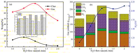 The effect of H2O steam and its flow rate (0.5 mL/min, 1 mL/min, 1.5 mL/min, 2 mL/min) on the catalytic pyrolysis of MWC was investigated. The product distribution and gas yield are shown in Figure 6. The analysis showed that the additional introduction of H2O steam promoted the catalytic pyrolysis process of MWC. In particular, when the flow rate of H2O steam increased to 1 mL/min, the gas yield and H conversion ratio increased obviously to 76.94%, 15.90%, and H2/CO ratio to 2.07. In the gas production composition, the yields of H2, CO, and CO2 were significantly increased to 107.35 mL/g-biomass, 53.70 mL/g-biomass, and 99.31 mL/g-biomass, respectively. This indicated that the additional introduction of H2O steam could provide a hydrogen source for the whole reaction process and significantly enhance the char gasification reaction (Equation (9)) and water vapor shift reaction (Equation (10)), which is beneficial to the production of H2 and other hydrocarbons [].