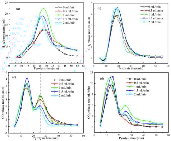 Effect of H2O flow rate on the gas release from catalytic pyrolysis of MWC, (a) H2 release rate, (b) CH4 release rate, (c) CO release rate, and (d) CO2 release rate.