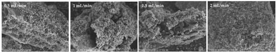Figure 7 shows the release rate of main gases at different flow rates of H2O steam. Obviously, as the flow rate of H2O steam increased to 2 mL/min, the gas yield decreased, and the tar yield decreased to a certain extent and then began to maintain equilibrium. This was because the tar had a self-reforming reaction with H2O and CO2, indicating that the additional introduction of H2O steam would shorten the residence time of tar-containing gas in the reforming reactor. Thus, the cracking/reforming reaction of tar was inhibited and consumed a lot of energy, which can be explained by Figure 8. As can be seen from Figure 8, the degree of carbon deposition on the surface of the catalyst increased with the increase in H2O steam flow rate, indicating that too much H2O steam reduced the conversion of tar, resulting in the accumulation of a large number of macromolecular substances to form carbon deposition and cover the surface of the catalyst. Therefore, the additional introduction of H2O steam promotes the steam gasification reaction of char and water–gas change reaction but avoids the introduction of excessive H2O steam.